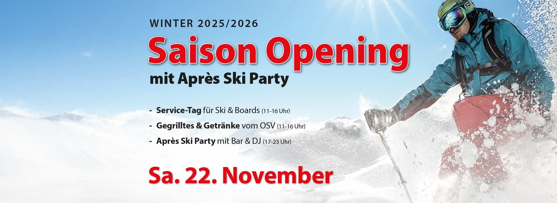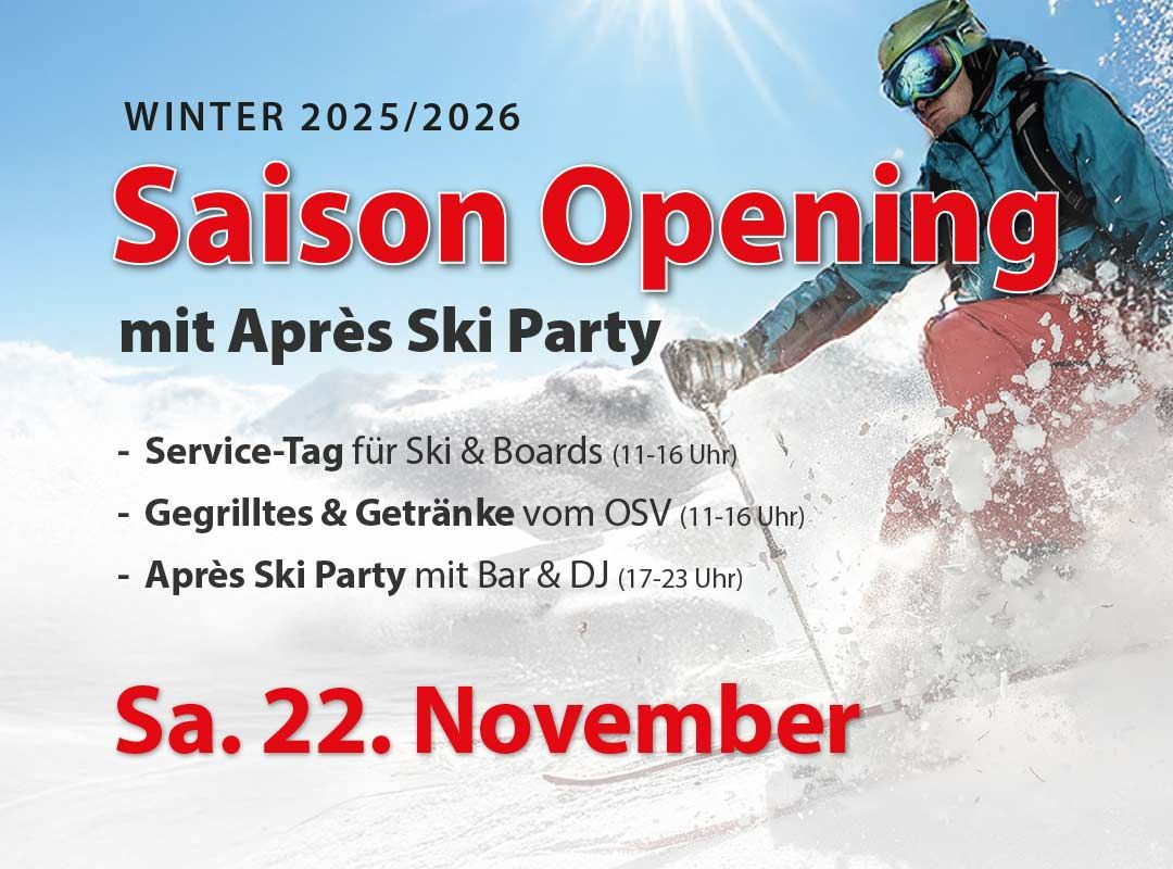 Bringen Sie Ihre Ski und Boards zum Service und machen Sie Ihre Ausrüstung bereit für den ersten Pistentag. Währenddessen erwartet Sie der OSV vor unserem Geschäft mit Gegrilltem und Getränken.