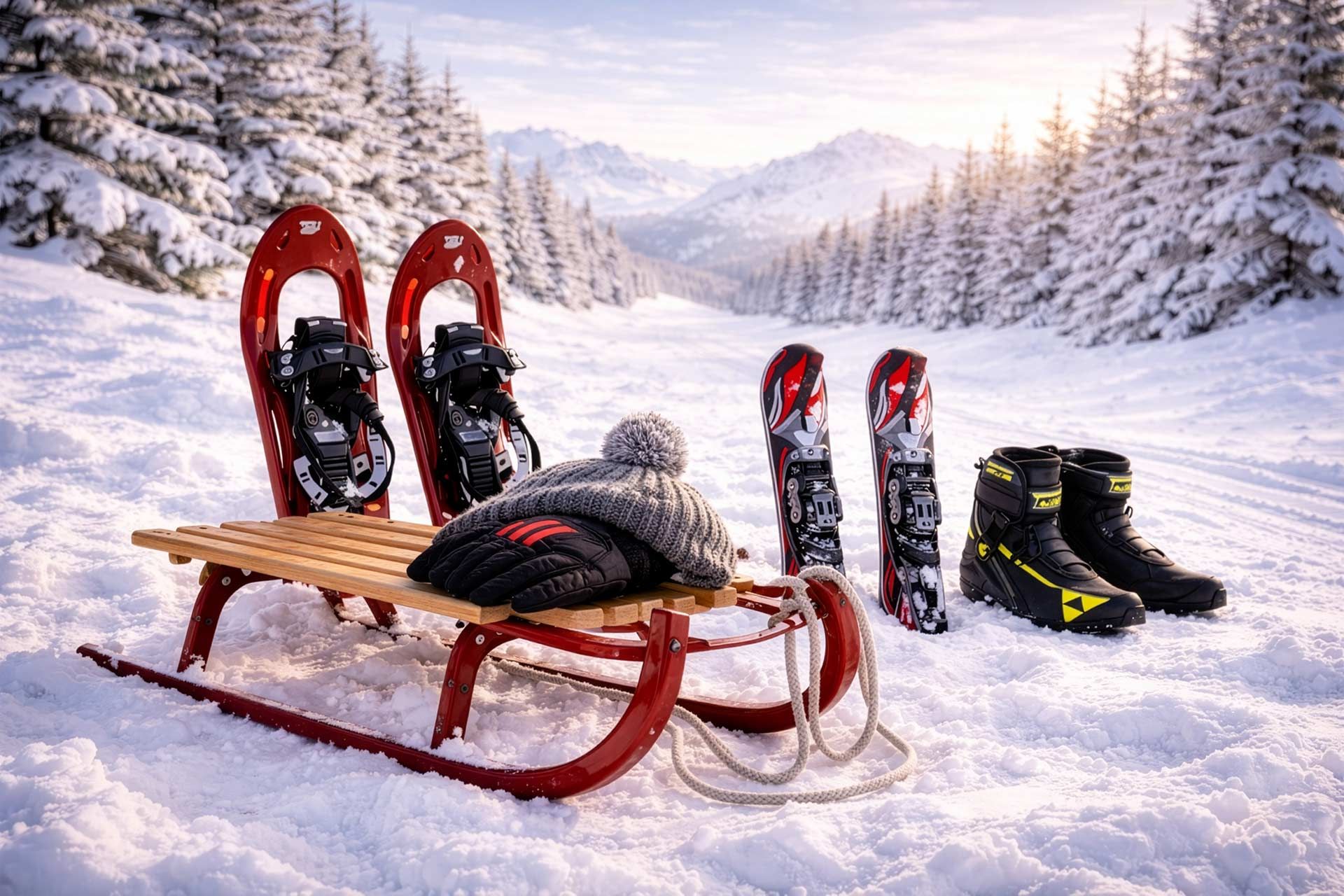 Für Winterwanderungen, Ausflüge und Familien: Schneeschuhe, Snowblades und Schlitten – schnell verfügbar und direkt startklar.